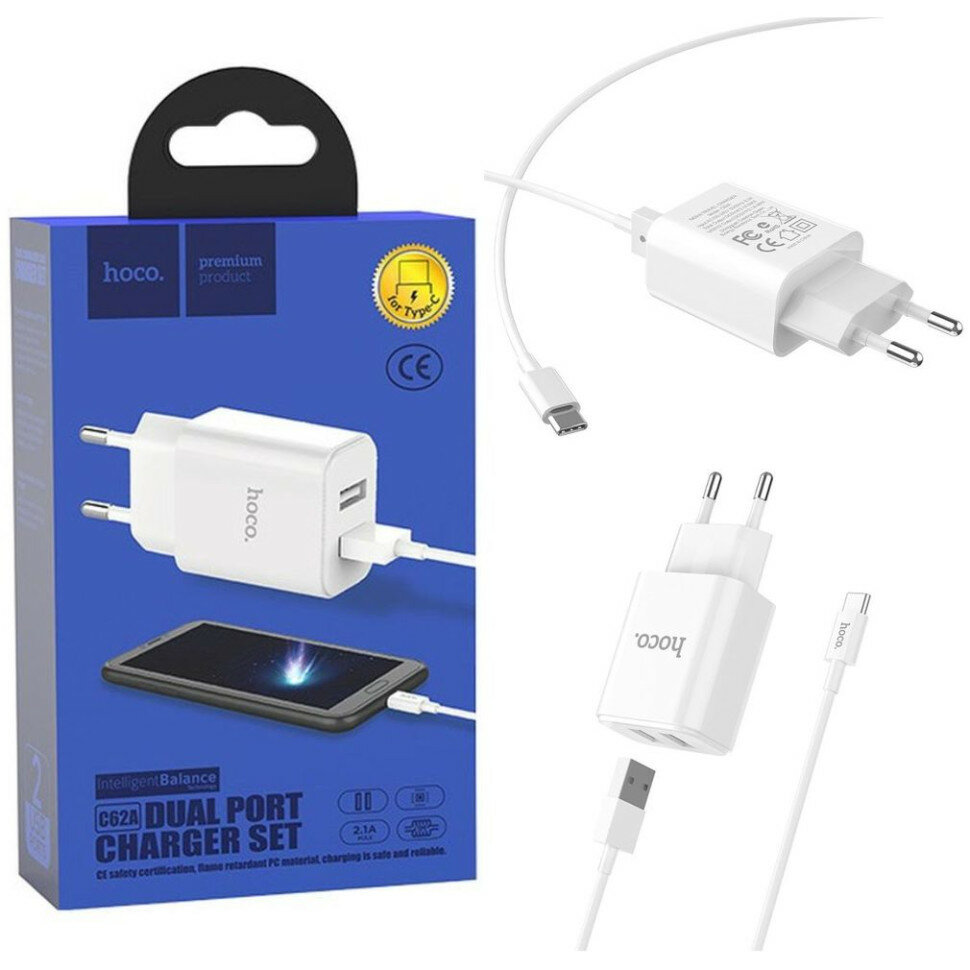 СЗУ, 2 USB 2.1A (C62A), HOCO, Type-C, Умная зарядка, белый