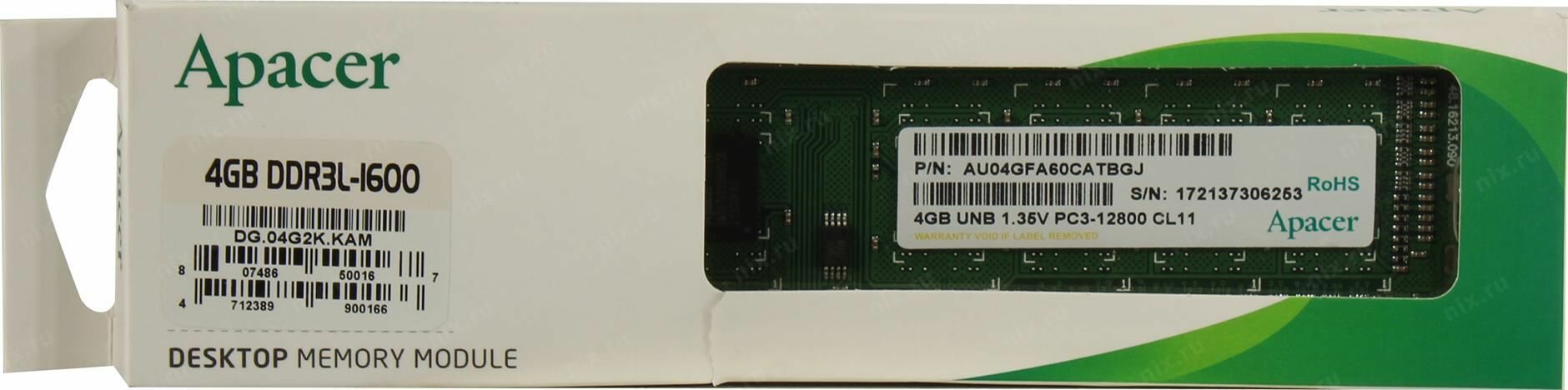 Оперативная память Apacer DDR3 4GB 1600MHz UDIMM (PC3-12800) CL11 1,35V (Retail) 512*8 3 years (AU04GFA60CATBGJ/DG.04G2K.KAM)