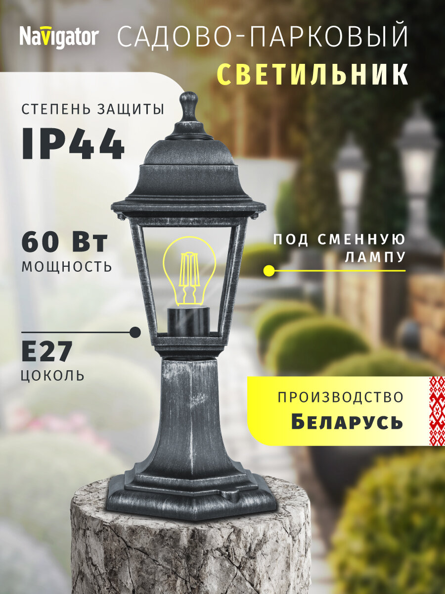 Купить Светильник садовый на постаменте Navigator 80 471, 4 грани, черный под серебро, IP44, цоколь E27