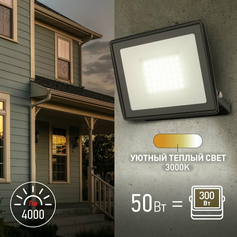 Прожектор светодиодный 50Вт 3000К черный IP65 150х145х24 4000Лм LPR-023-0-30K-050 ЭРА