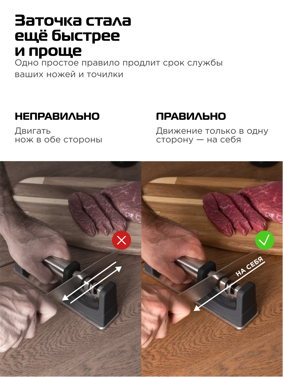 Нужно приноровиться, подходит не для всех ножей( это дело в стали), а так вещь очень быстро хорошая и нужная на кухне.