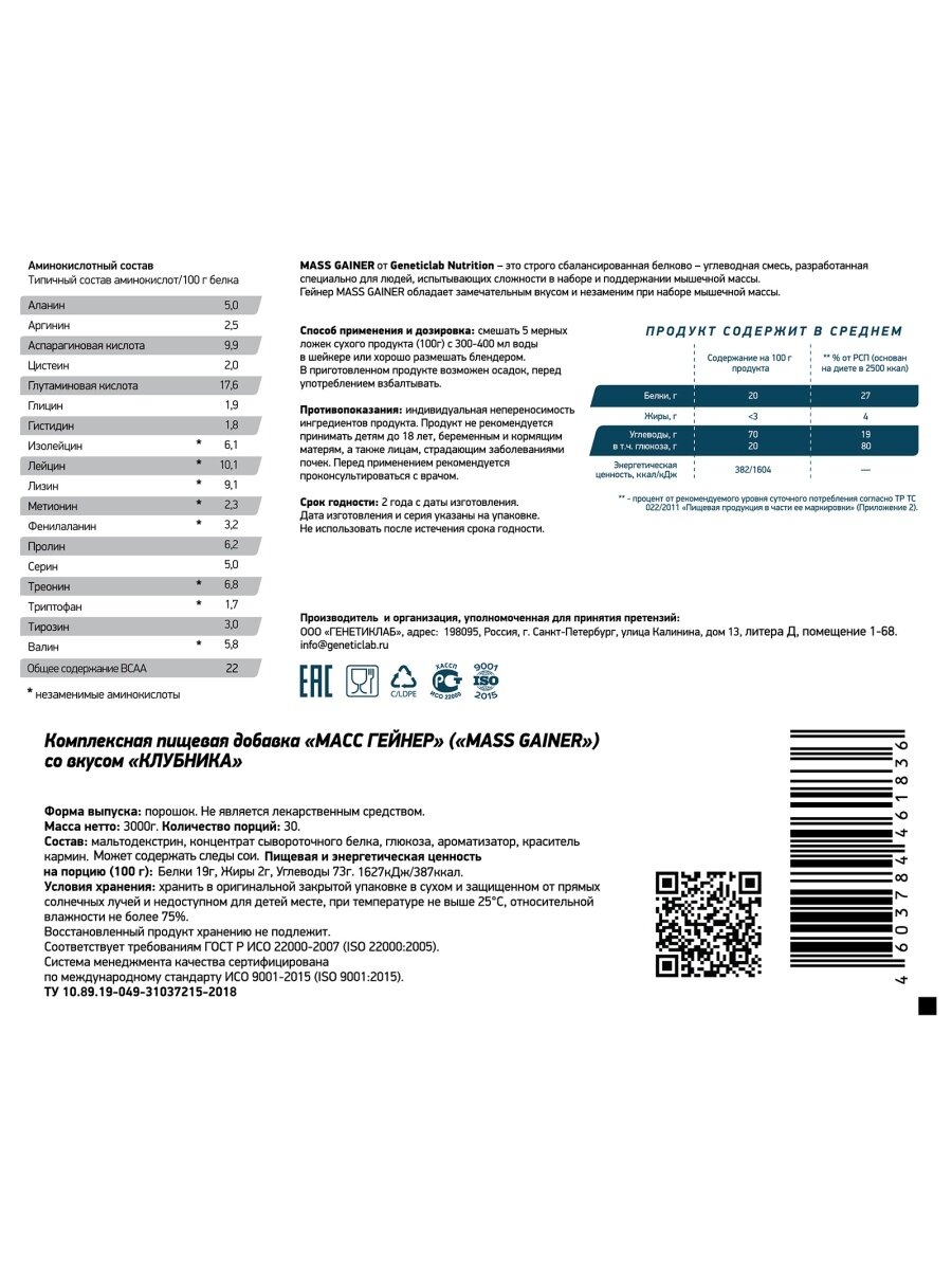 GeneticLab Nutrition Гейнер Geneticlab Nutrition Mass Gainer (3000 г) Клубника интересное:
