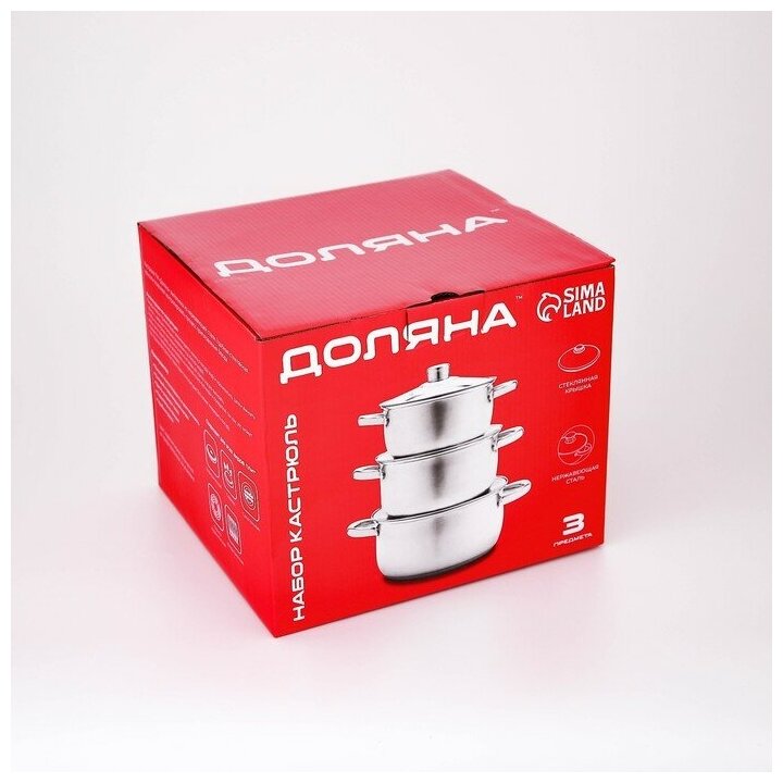 Набор кастрюль из нержавеющей стали Доляна, 3 предмета: 2,3 л, 3,2 л, 4,2 л, крышки