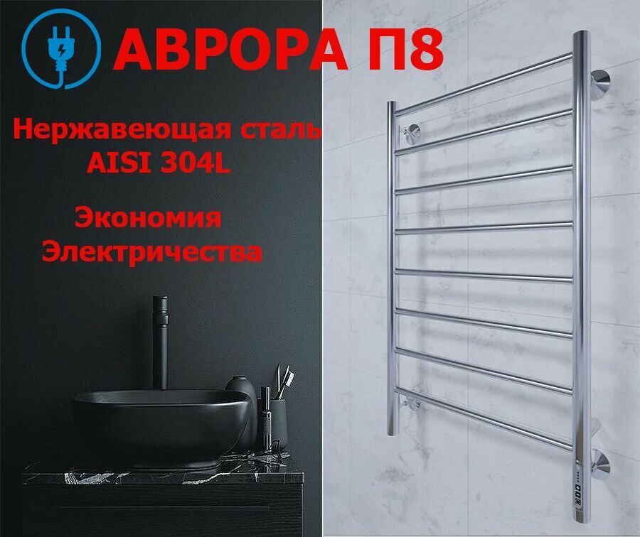 Полотенцесушитель электрический TERMINUS (Терминус) Аврора П8 400х850 мм, сверхпрочная пищевая нержавеющая сталь, диммер 5-ого поколения Quick Touch, гарантия 5 лет/ Электрический полотенцесушитель с терморегулятором