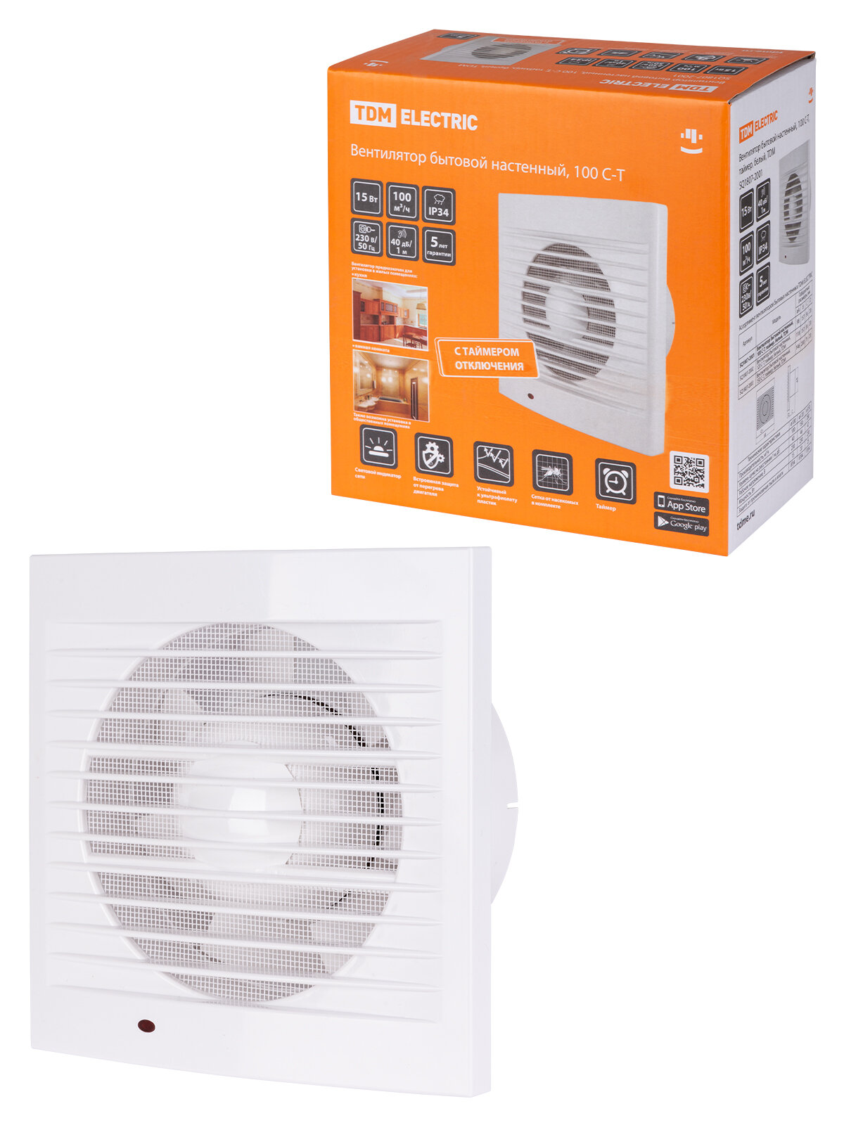 Вентилятор вытяжной бытовой настенный с таймером, установочный диаметр 100 мм, белый, IP34, 15Вт, 157х157х76 мм
