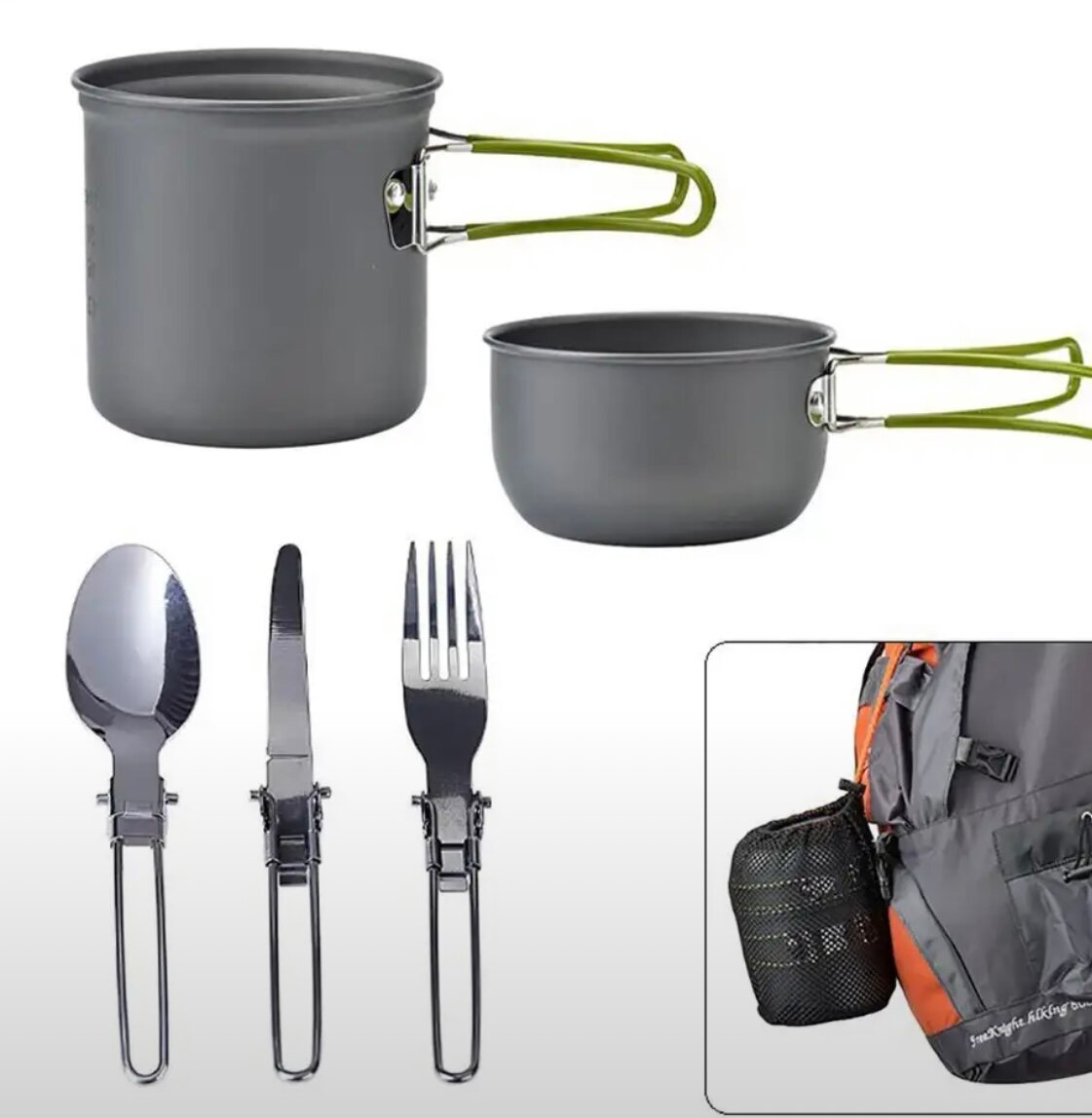Набор посуды туристический: 2 кастрюли, вилка, ложка, нож