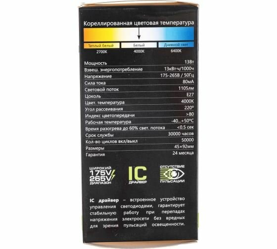Лампочка светодиодная шар малый E27/G45 13Вт 1105Лм белый нейтральный 4000К, 38105 интересное: