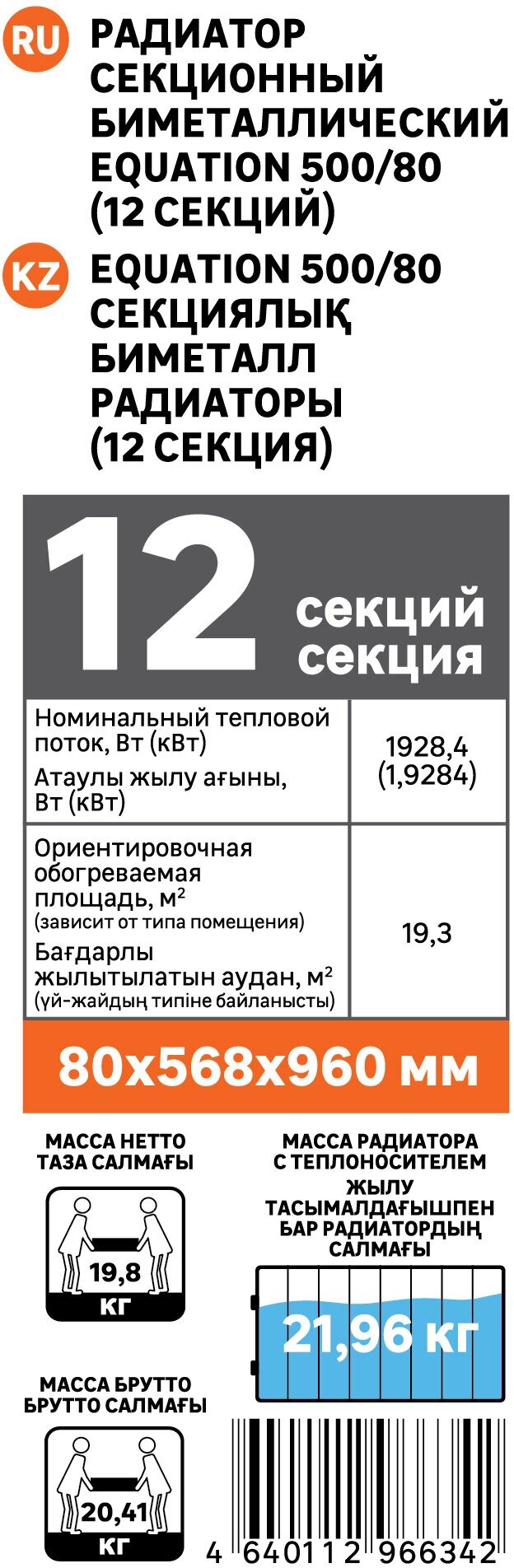 Радиатор Equation 500/80/12, 12 секций, боковое подключение, биметалл