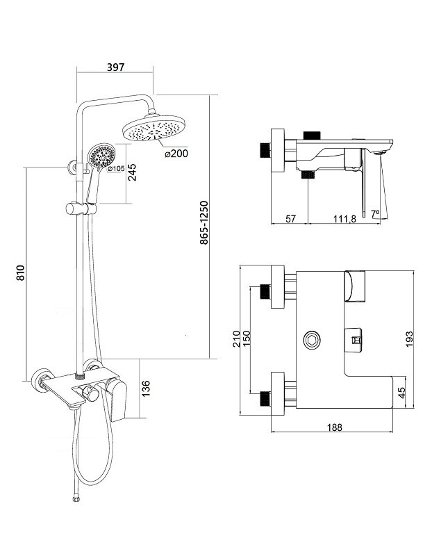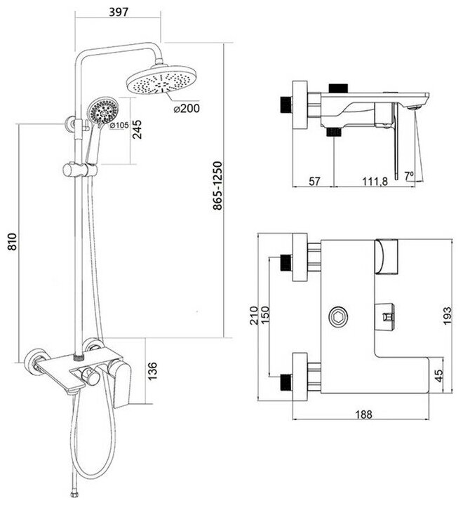 | Комплектация | верхний душ / шланг для душа / смеситель с изливом / душевая лейка / душевая штанга / держатель лейки / держатель штанги / эксцентрики / инструкция |