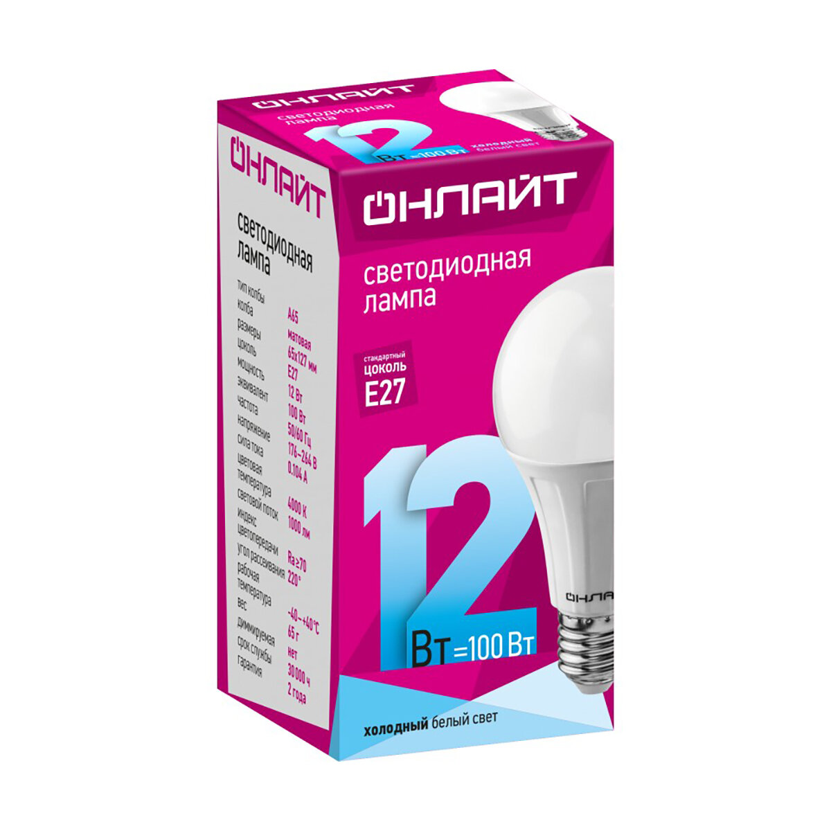 Лампа светодиодная E27, 12 Вт, 100 Вт, груша, 4000 К, свет холодный белый, Онлайт