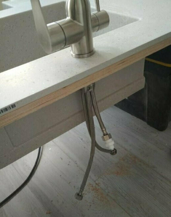 Но имейте ввиду, что он расчитан на тонкие столешницы, может специальное углубление, ну или как у них там ещё в европах... Я же решил разориться на столешницу из искуственного камня, она толщиной 37мм, и его резьбы не хватило, пришлось вырезать углубление в столешнице снизу, благо она не монолитная, а на деревянном основании, и у мастеров всё необходимое для этого было, но могли и встрять. Так же я не подумал о том, что рычаг должен иметь запас хода для поворота и не стоять очень близко к стенке. У меня же как видно на фотке места подвинуться там не было, и теперь при включении холодной воды в закрытом состоянии он ударяется об плитку, в открытом правда всё нормально из-за изменения угла, но к этому надо привыкать и аккуратно пользоваться. |