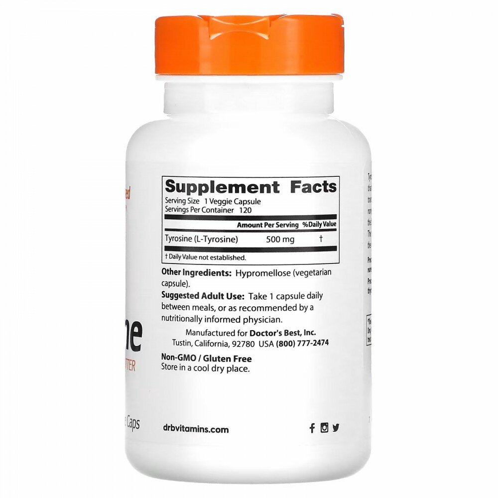 Купить Doctor's Best Л тирозин / Докторс Бест L Tyrosine 500 мг для повышения жизненного тонуса, для похудения , вегетарианские капсулы №120 Doctors Best Доктор Бест