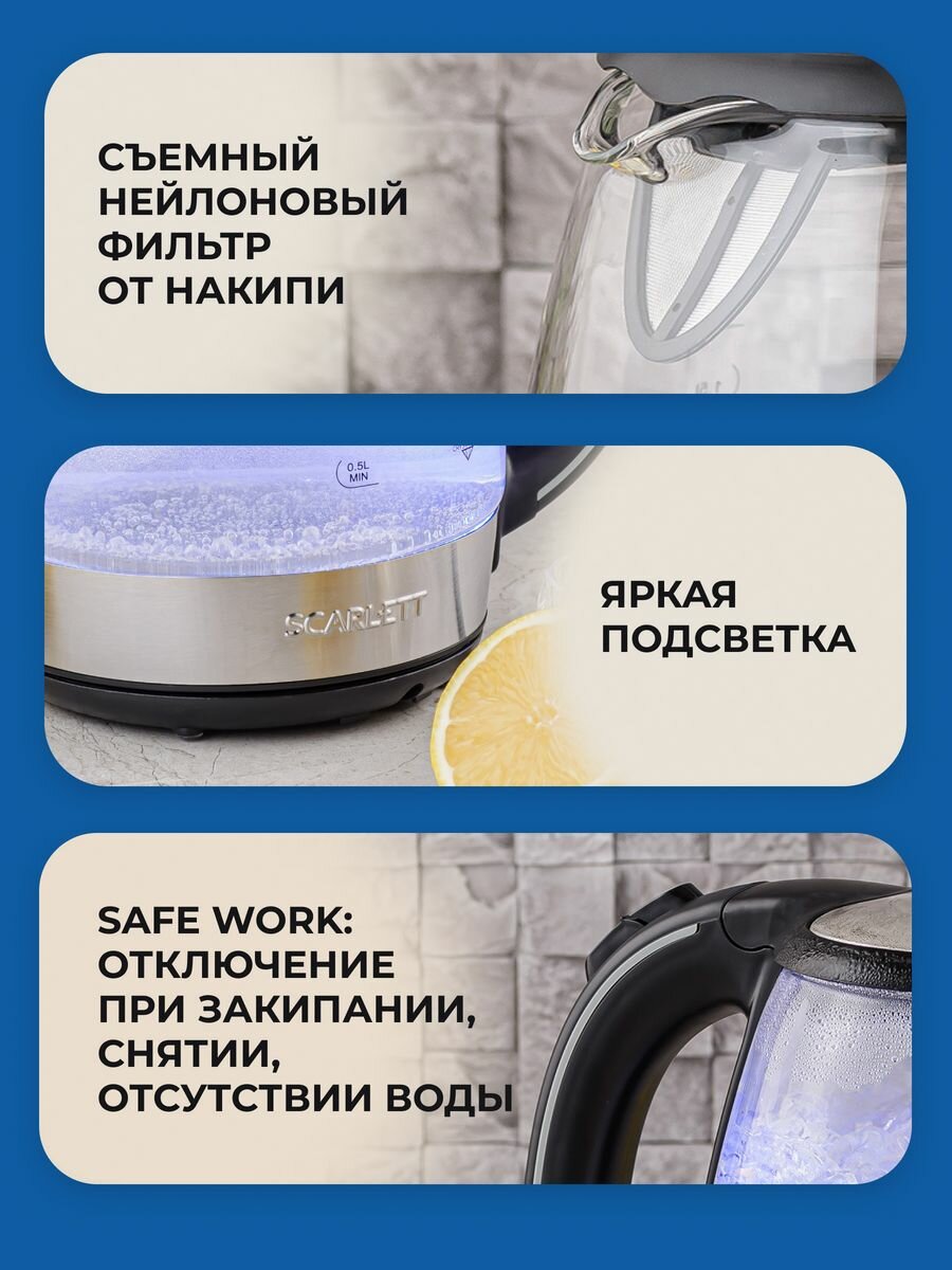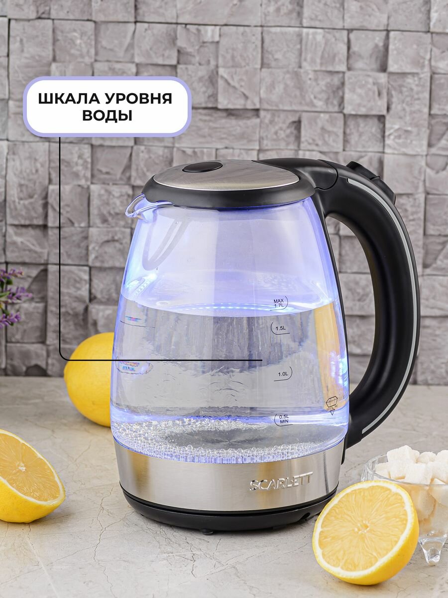 Удачная новинка от Скарлет, чайник просто находка, закипает очень быстро, есть подсветка, при закипании зрелище завораживает. Крышка открывается автоматически и довольно широко, воду доливать удобно. Ручка большая, в хвате удобная, рука не проскальзывает.