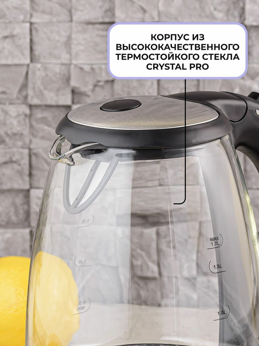 На кухне вся техника из стали и чайник вписался в эту композицию. Закипает, как нужно, быстро. С красивой синей подсветкой. Видно движение пузырьков через стеклянный корпус.
