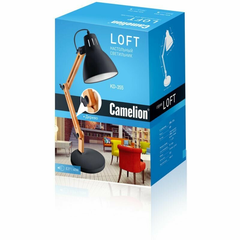 Светильник Camelion KD-355 C02 (14158) настольный на основание E27 черный 40Вт 14158 .