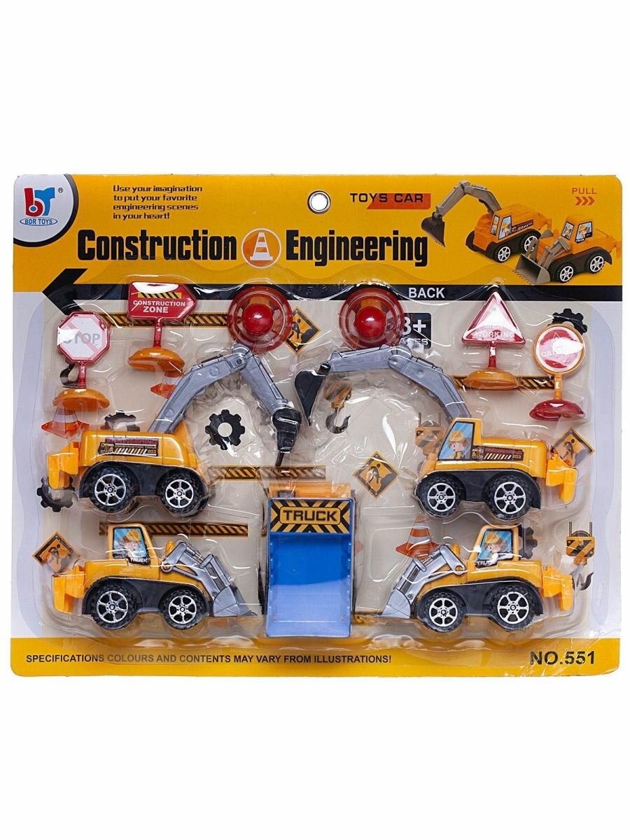 Набор игровой Строительная техника (5 инерционных машинок и дорожные знаки), пластмассовые, на блистере - Junfa Toys [WZ-17132]
