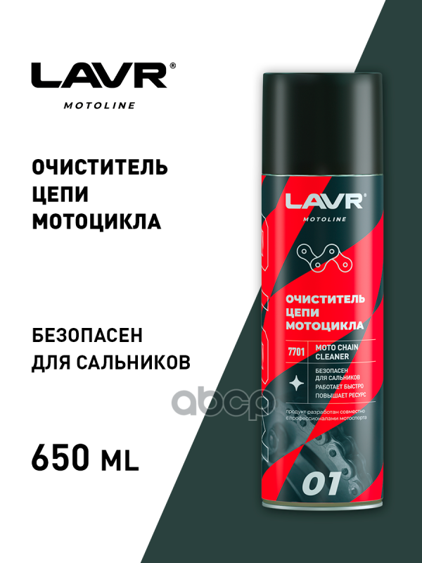 LAVR LN7701 Очиститель цепей 650мл - очиститель цепи мотоцикла, подходит для всех типов приводных цепей мото- и велотехники, безопасен для O, X и Y сальников, аэрозоль