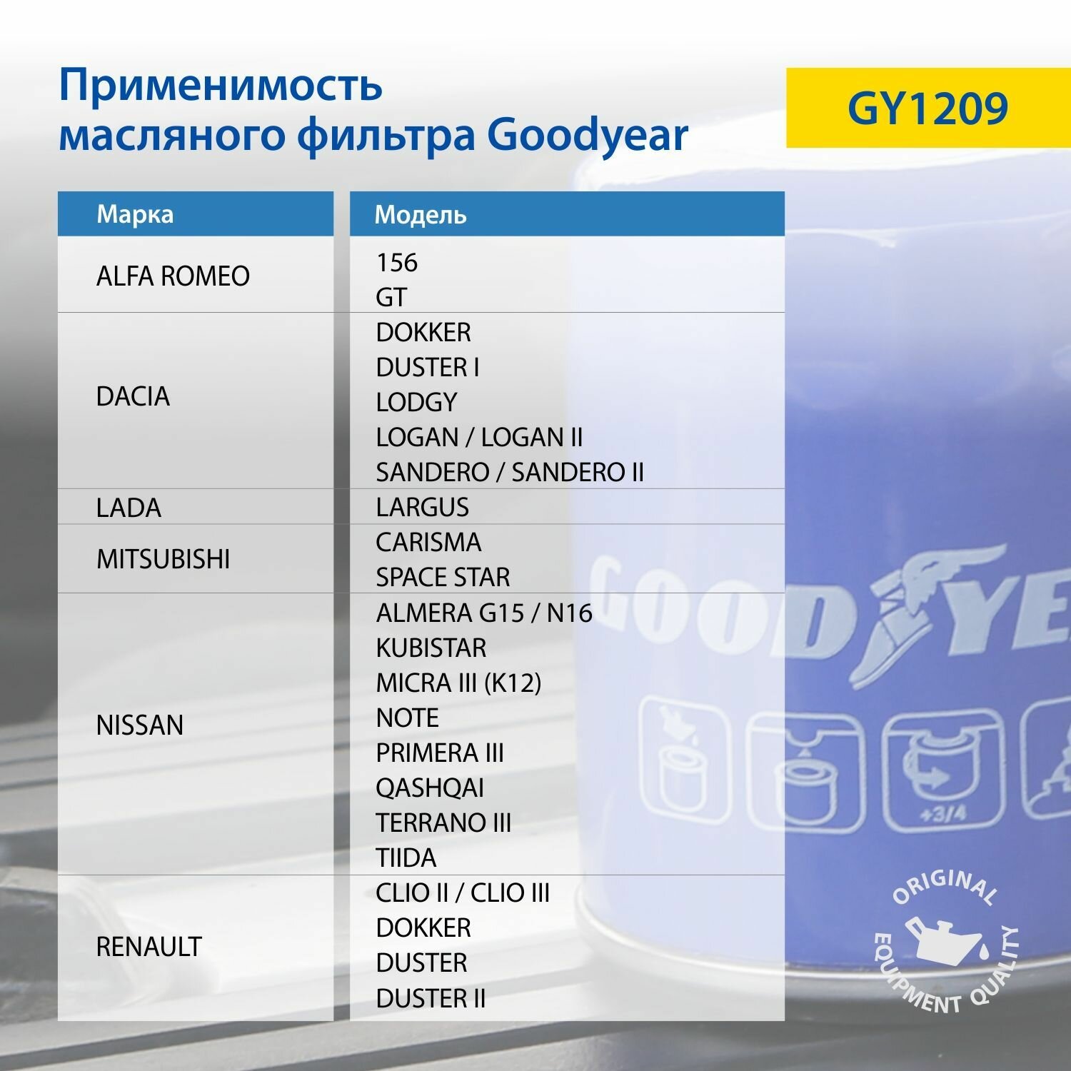 GOODYEAR GY1209 Фиьтр масяный автомобиьный Goodyear дя а/м LADA: LARGUS, NISSAN: ALMERA, NOTE, QASHQAI, T