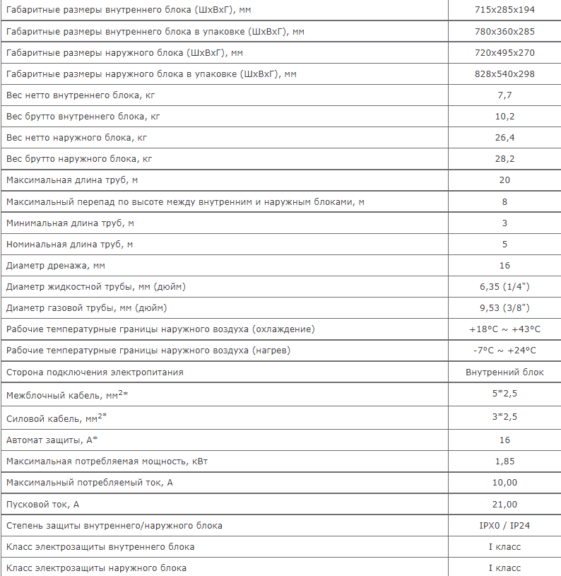 | Дополнительная информация | Wi-Fi управление через приложение NETHOME PLUS (при покупке Wi-Fi модуля); холодопроизводительность 2,85 кВт; теплопроизводительность 2,92 кВт; максимальный межблочный перепад высоты 8 м; максимальная длина труб 20 м; диаметр жидкостной трубы 6,35 мм; диаметр газовой трубы 9,53 мм; Уровень шума наружного блока 54,5 дБ; диапазон температур, холод +18 +43 °С; диапазон температур, тепло -7 +24 °С |