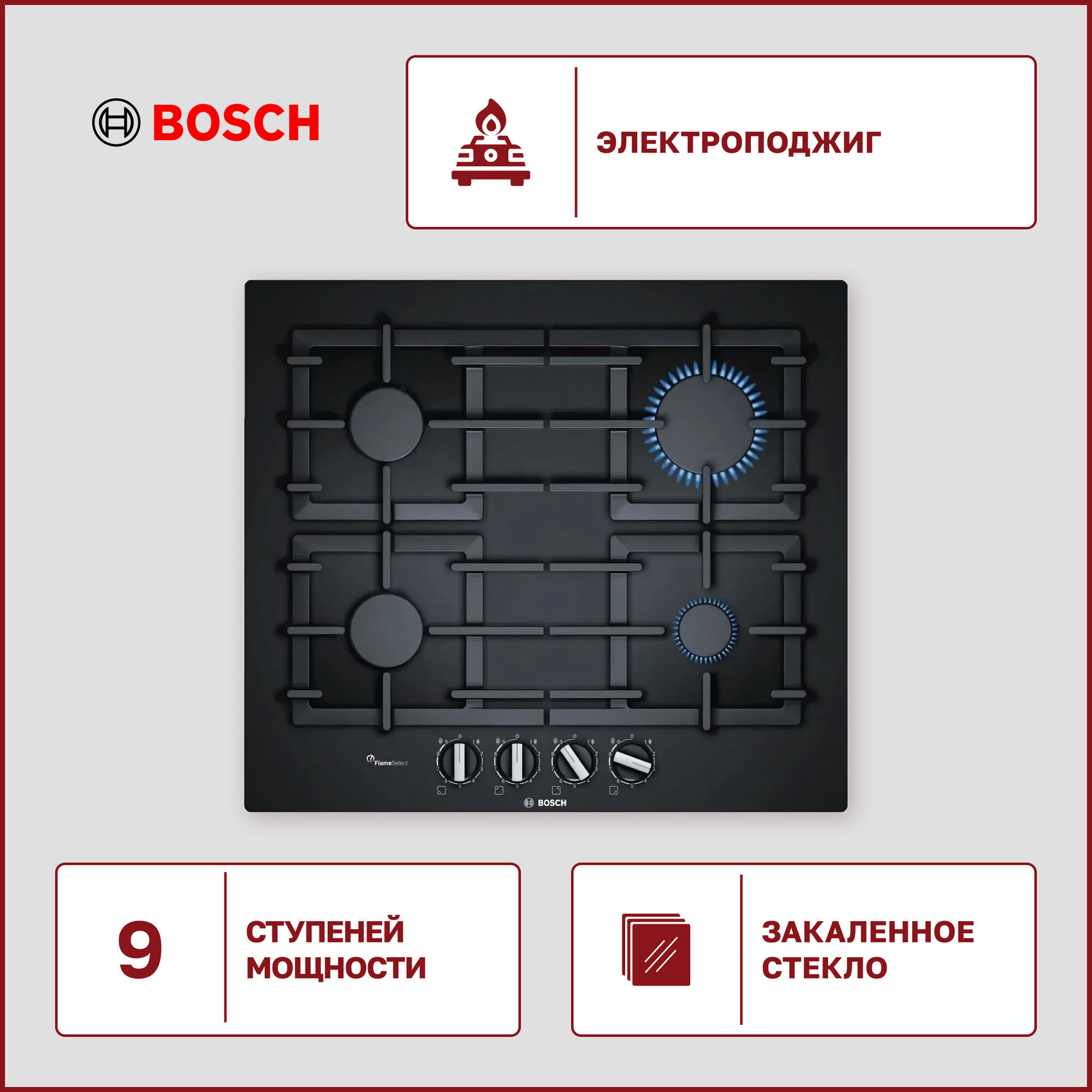 Газовая варочная поверхность Bosch PPP6A6B90 FlameSelect, черный