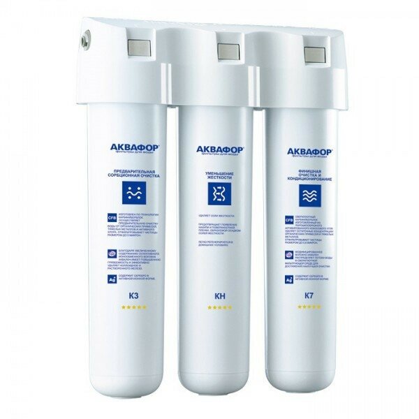 | Плюсы: | Быстро и удобно меняются. В течение года служили без проблем. В комплект к этим трем есть еще КН, который нужно менять месяца через три (для моей воды). |