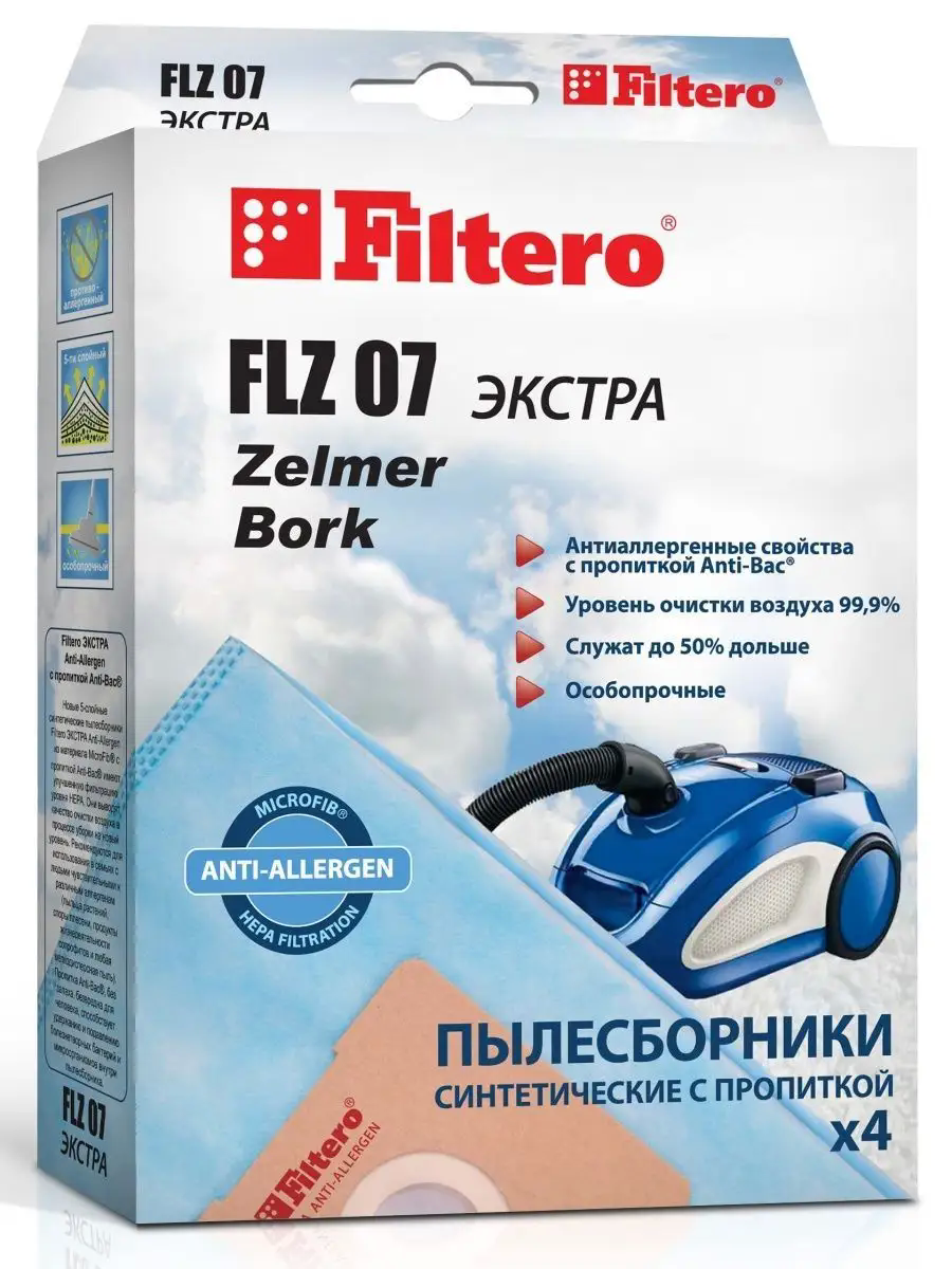 Мешки для пылесосов Zelmer, Bork, Filtero FLZ 07 (4) экстра (4 штуки) (PN: FLZ 07).