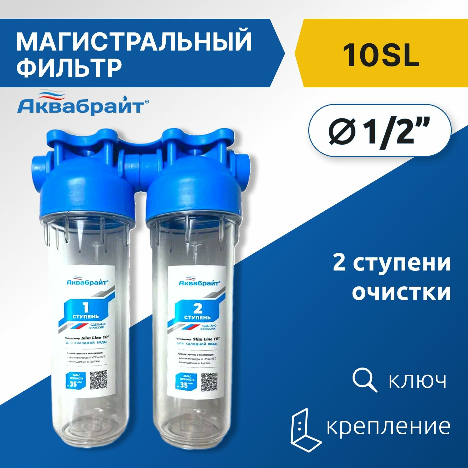 Фильтр двухступенчатый аквабрайт SLIM LINE АБФ-2 3/4, лат.резьба 3/4", кронштейн и ключ в комплекте