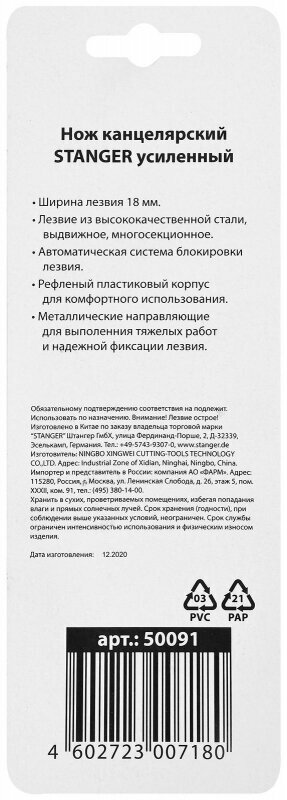 | Дополнительная информация | Marginality:0 ErpCategoryId:5637146140 название дизайна, серии,модели, бренда:усиленный STANGER материал изделия:комбинированный фиксатор:Да вид офисных принадлежностей:Нож канцелярский ширина лезвия, канц.нож:18 мм |