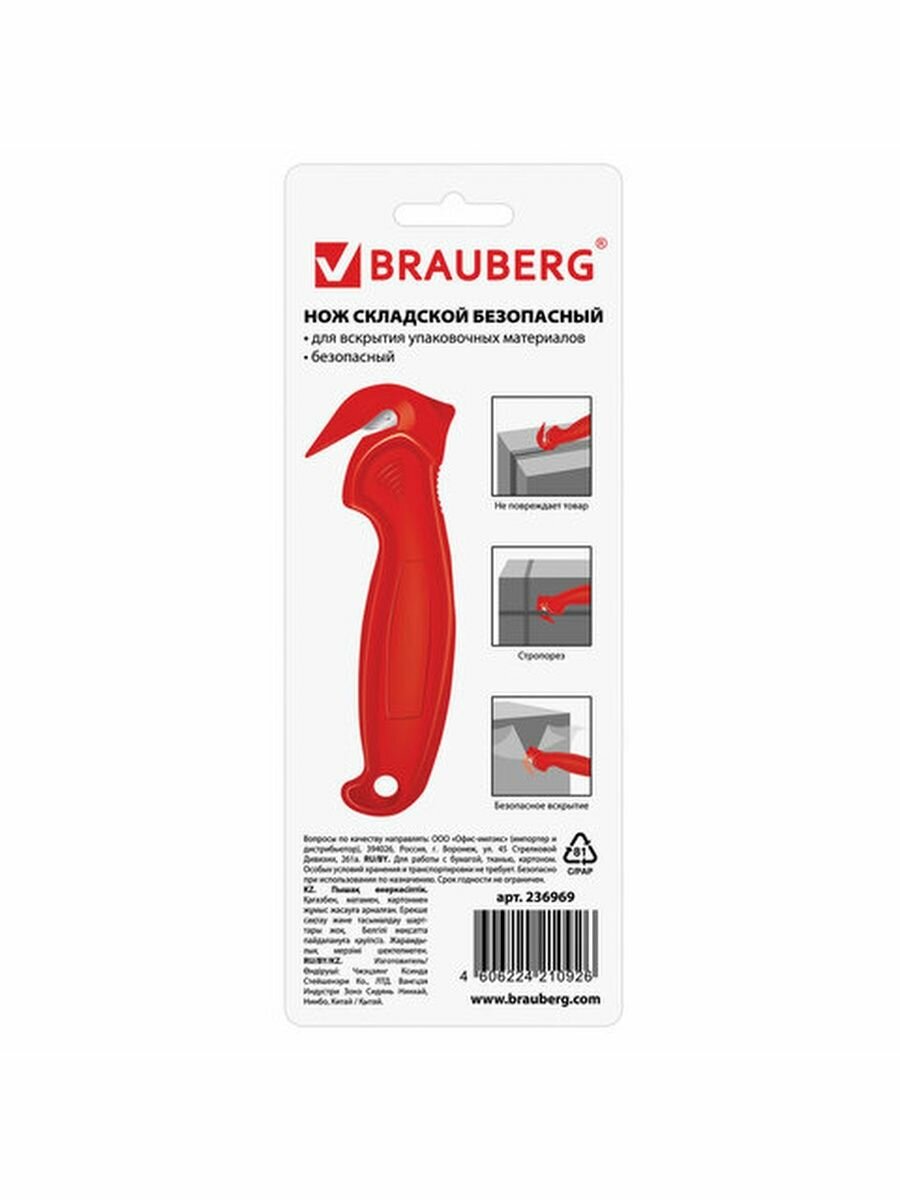 Нож складской безопасный BRAUBERG "Logistic", для вскрытия упаковочных материалов, красный, блистер, 236969 Комплект : 1 шт .