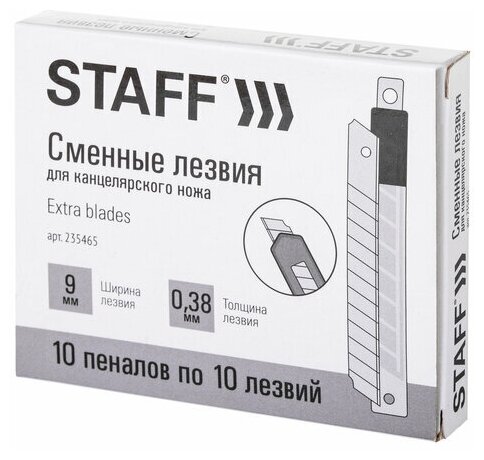 Лезвия для ножей 9 мм комплект 10 ШТ., толщина лезвия 0,38 мм, в пластиковом пенале, STAFF "Basic", 235465 (цена за 1 ед.товара)