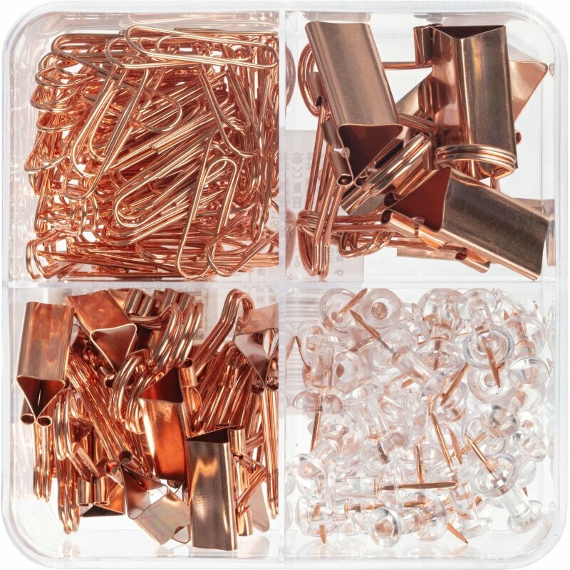 | В комплекте | В наборе: гвоздики с прозрачной шляпкой и острием из розового металла 50шт, высота гвоздика 2см. зажимы для бумаги из розового металла, 15шт, ВШ: 36х18мм. зажимы для бумаги из розового металла 6шт, ВШ: 47х25мм. скрепки канцелярские, 100шт, ВШ: 29х8мм. |