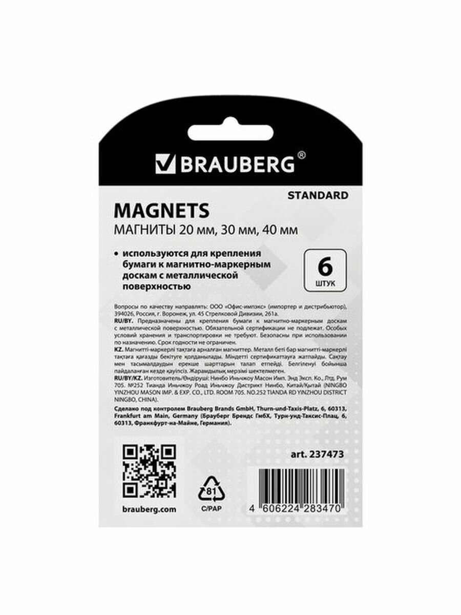 Магниты BRAUBERG «STANDARD», набор 20 мм — 2 шт., 30 мм — 2 шт., 40 мм — 2 шт., серые, BRAUBERG, 237473 /Квант продажи 1 ед./