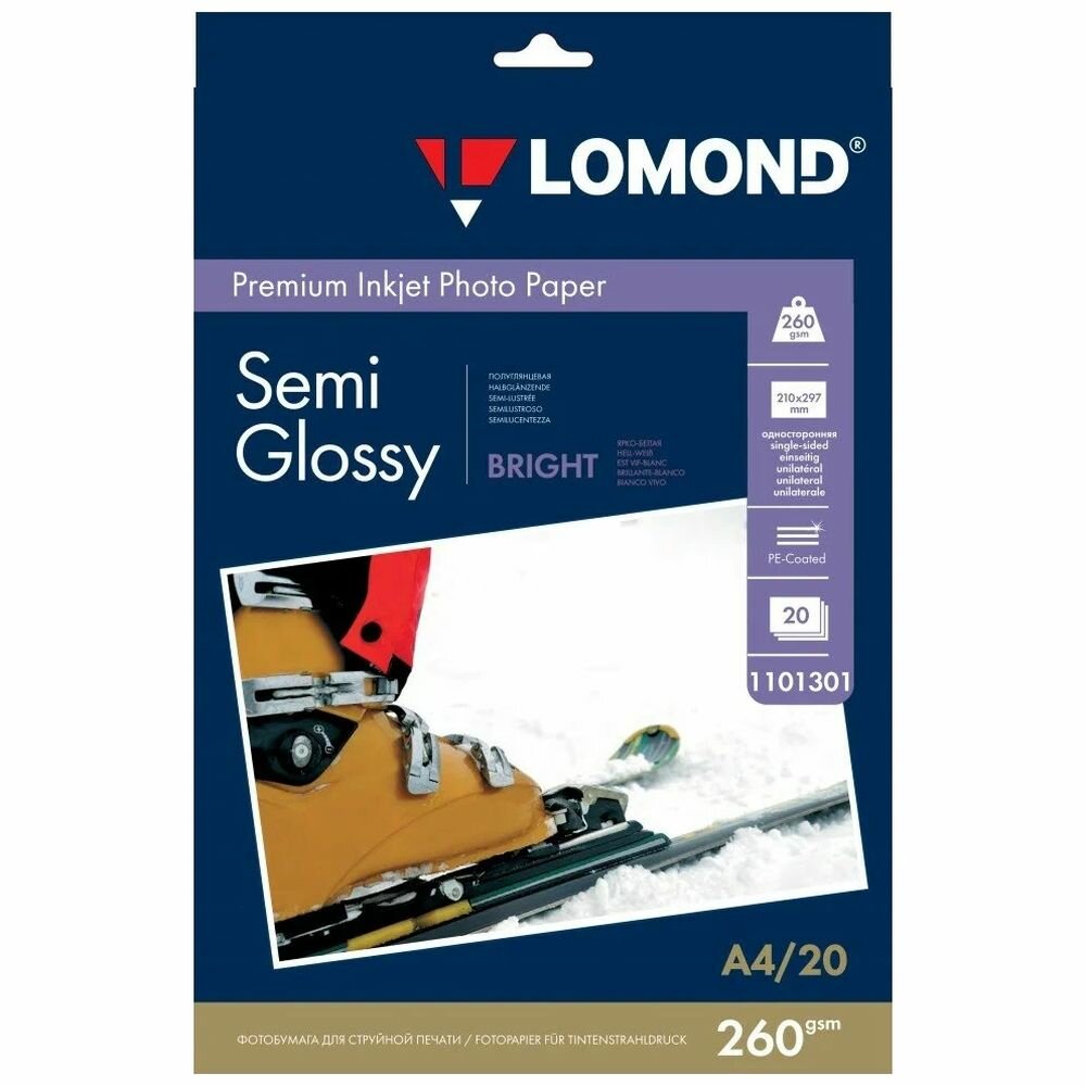 Фотобумага Lomond A4, 260 г/м2 (20 листов) полуглянцевая, ярко-белая (Semi Glossy Bright) (1103301)