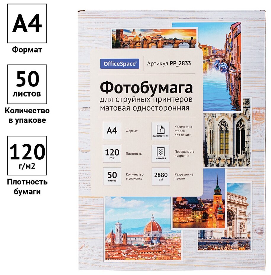 Фотобумага OfficeSpace А4, для струйных принтеров, 120 г/м2, (50 листов), матовая, односторонняя (PP_2833)