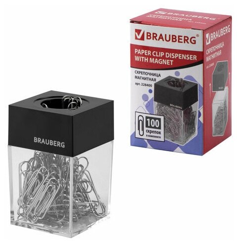 Скрепочница магнитная BRAUBERG со 100 никелированными скрепками 28 мм, прозрачный корпус, 228400 В комплекте: 1шт.