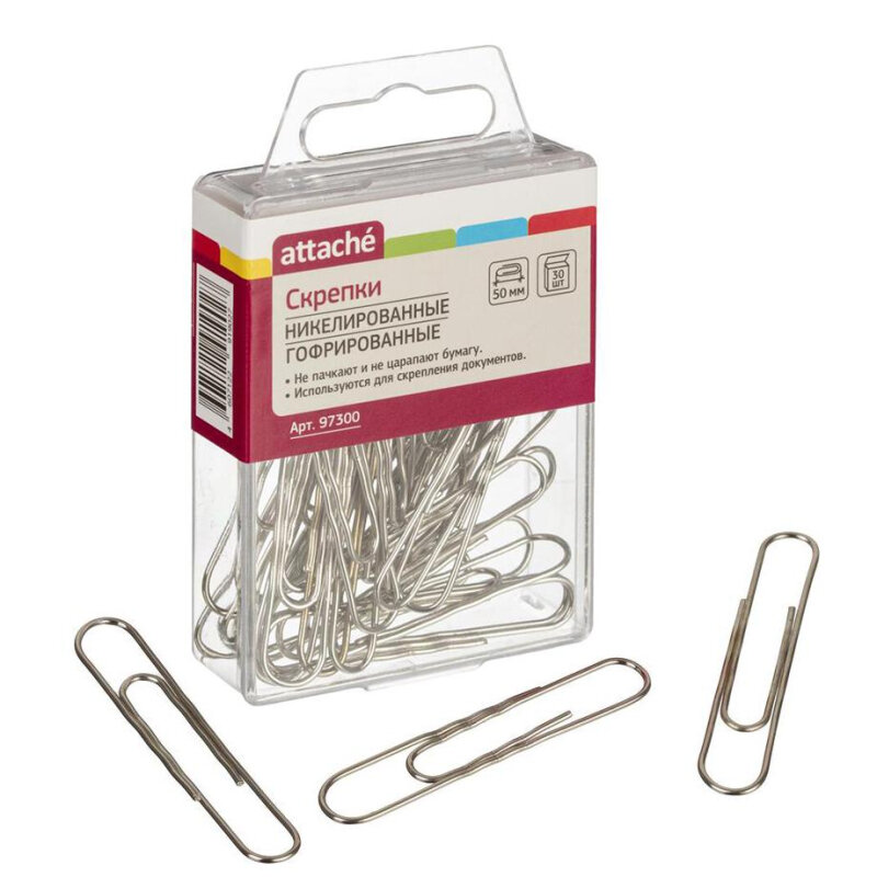 Скрепки Attache металлические никелированные гофрированные 50 мм (30 штук в упаковке), 97300