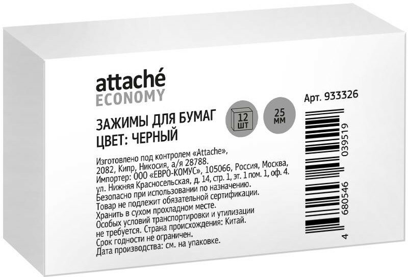 Зажимы для бумаг 25мм 12шт/уп Attache Economy, в карт,кор, цвет черный