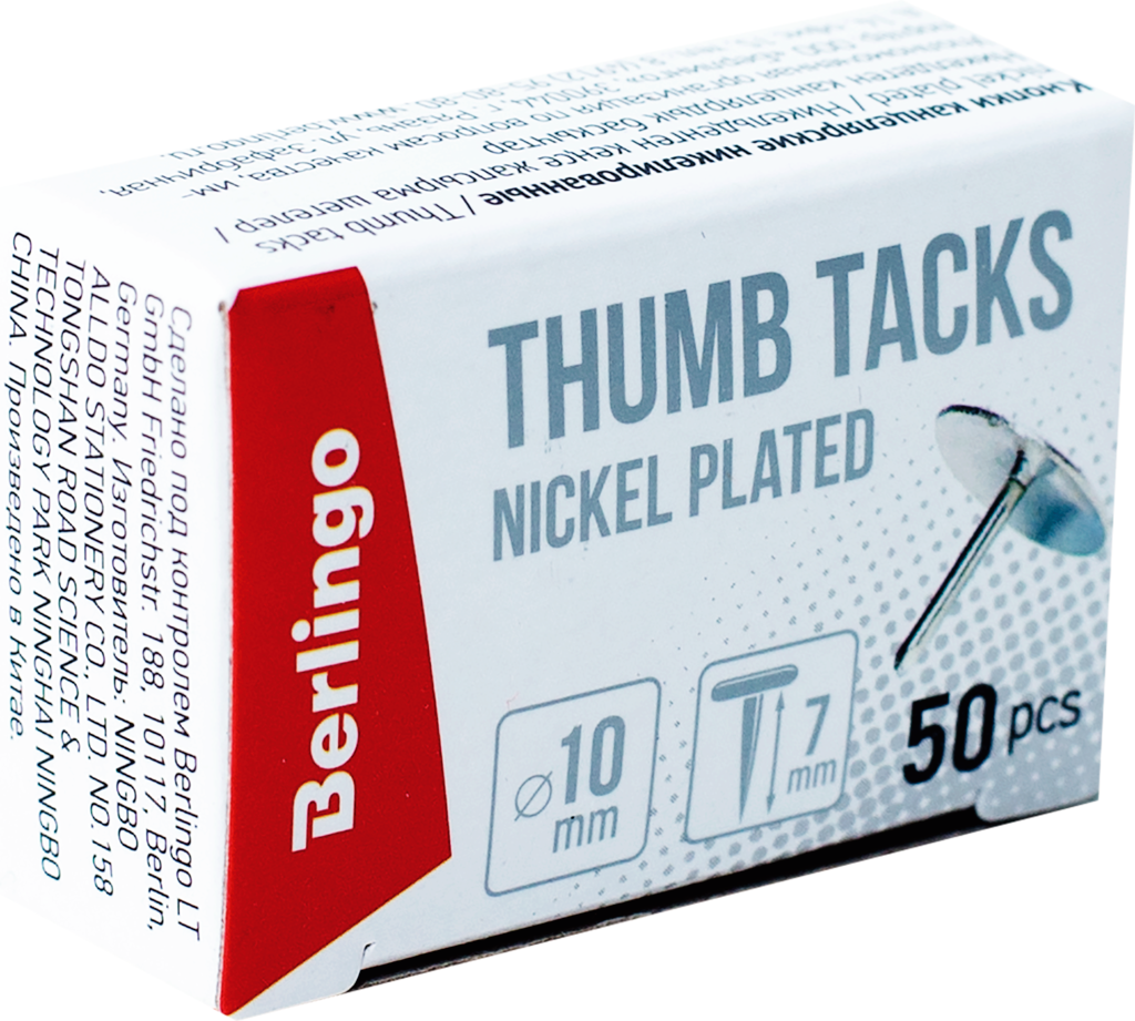 Купить 116003 Кнопки канцелярские/гвоздики Berlingo, никелированные 10мм, 50шт., карт. упаковка