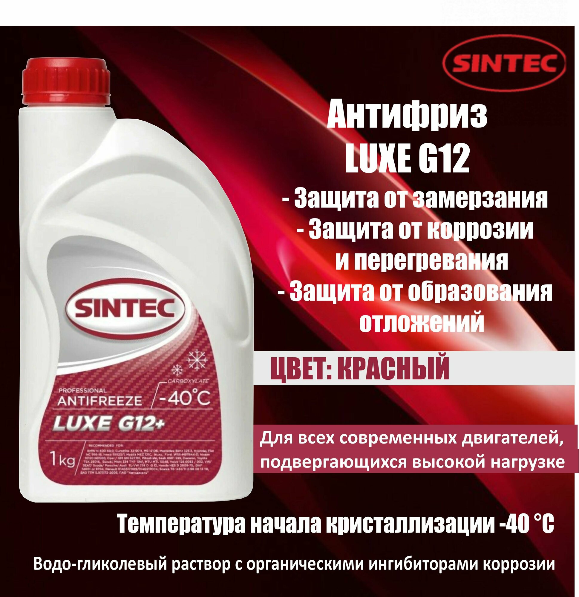 SINTEC LUXE G12+ -40 карбоксилатный антифриз 1кг для двигателя автомобиля, охлаждающая жидкость синтек в авто, красный, готовый к применению