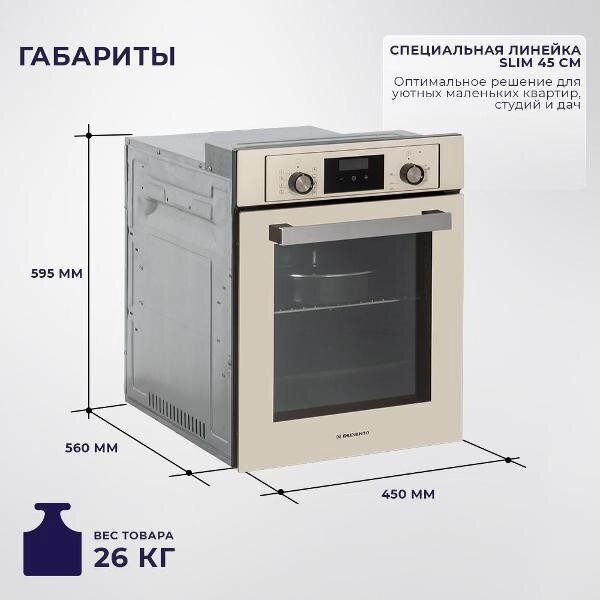 Духовой шкаф электрический встраиваемый 45см бежевый / 9 режимов (гриль + конвекция) / DELVENTO V4ER59001 / дисплей / таймер 90 мин, часы / двойное стекло LOW-E / хром. решетка и 2 противня: стандартный + круглый / подсветка / гарантия 3 года /