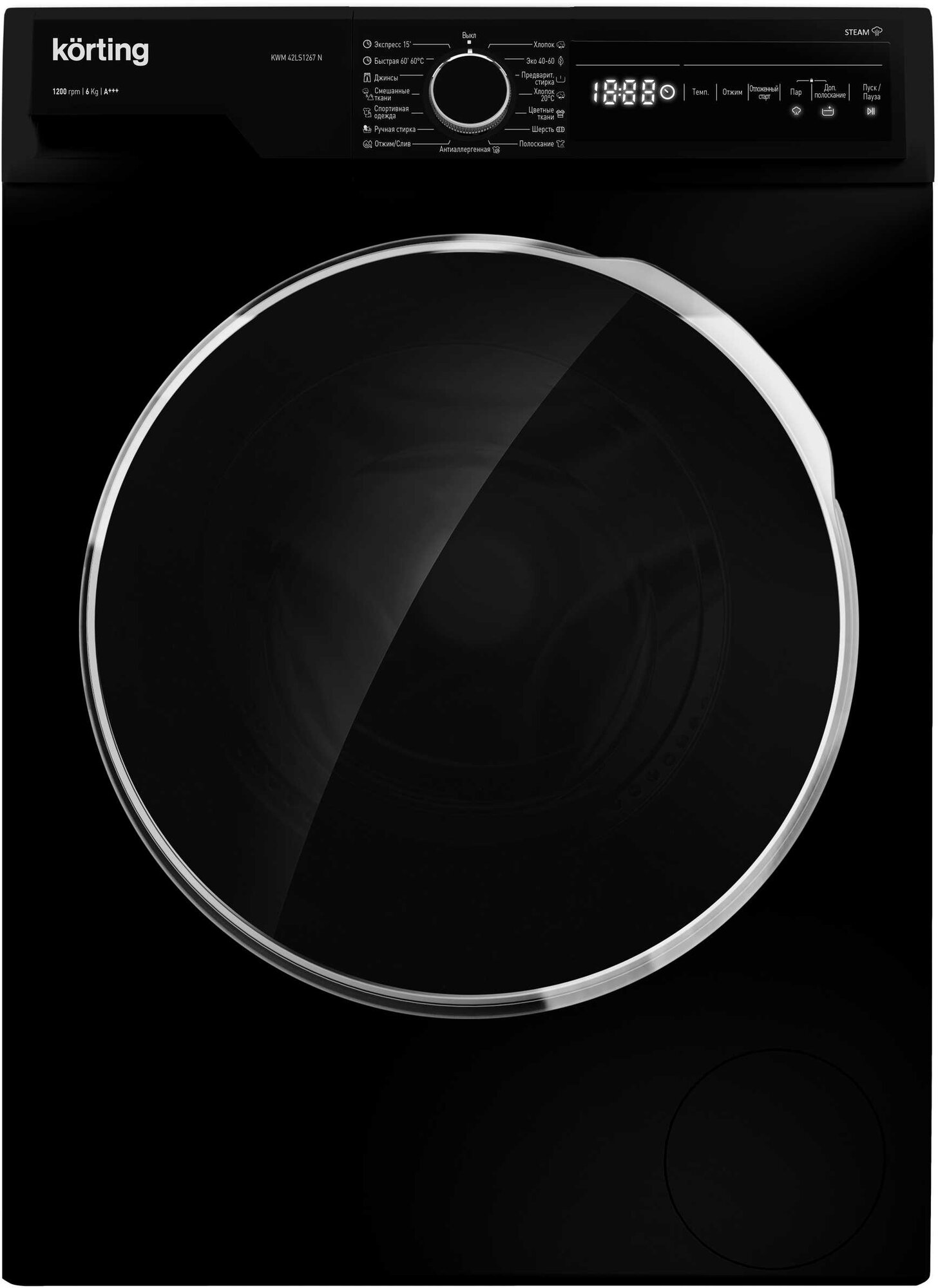 Узкая стиральная машина с паром Korting 42LS1267 N, черная, 15 программ, загрузка до 6 кг, функция паузы, защита от детей