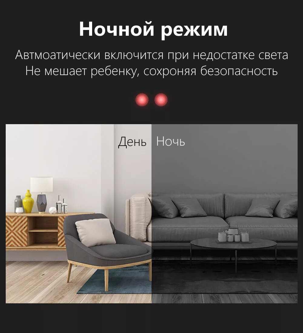 | Особенности | термометр, подвижная камера, функция ночного видения, работа от сети 220 В, голосовая активация (VOX), колыбельные мелодии, двусторонняя голосовая связь, датчик движения |
