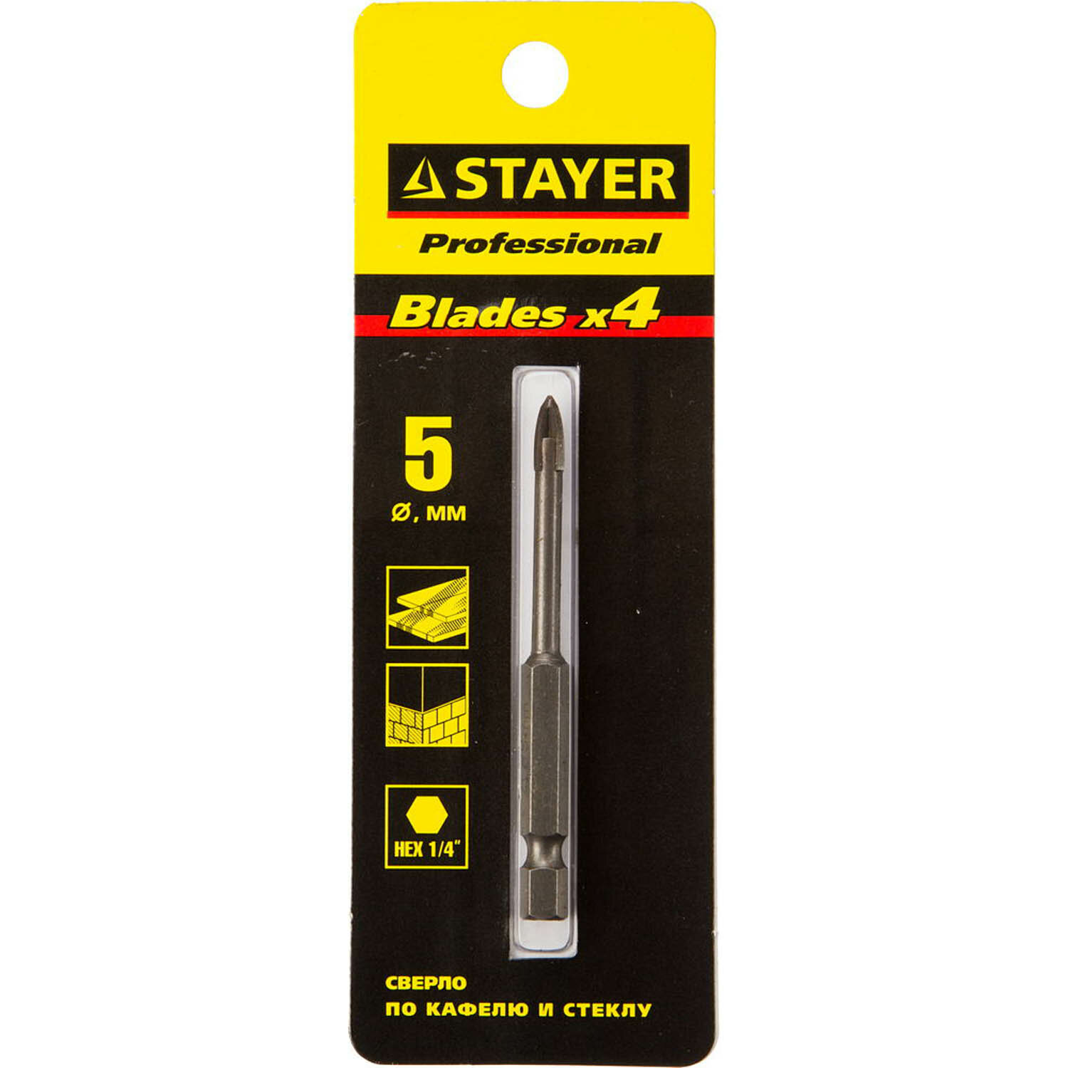 Сверло по кафелю, керамике, стеклу, с четырьмя режущими лезвиями, шестигранный хвостовик, 5 мм, STAYER ?PROFESSIONAL? 2985-05