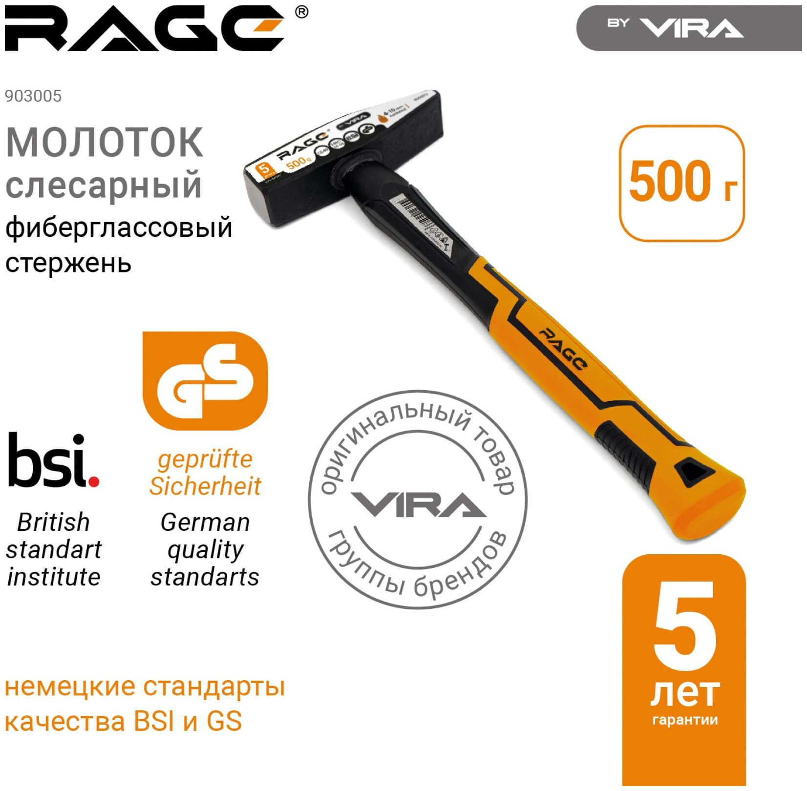 Молоток слесарный VIRA Rage 500 г, фиберглассовая ручка 903005