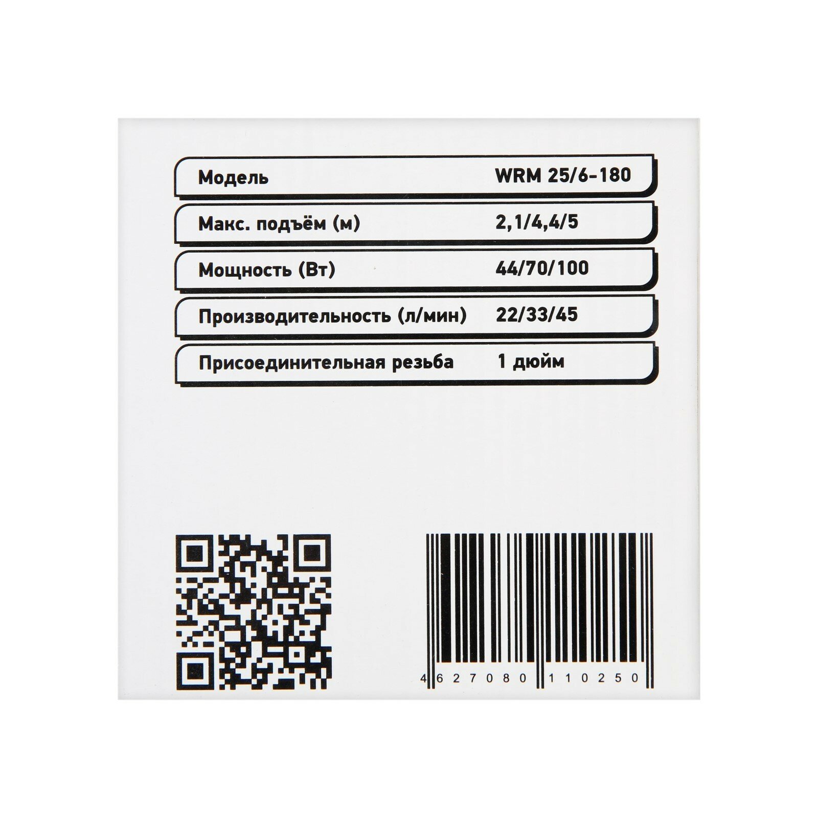 Насос циркуляционный WRM-25/6-180, 100/70/44 Вт, напор 5 м, 45/33/22 л/мин, без кабеля