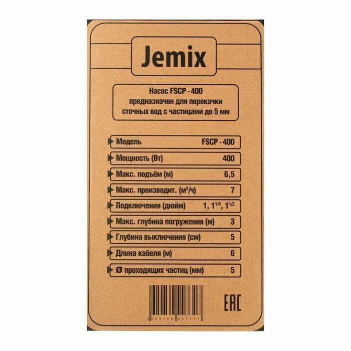 Насос дренажный, Jemix, 6 м, 400 Вт, погруж3 м, напор6.5 м, 7 м³/ч, FSCP-400