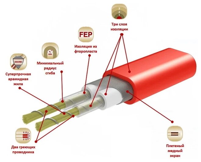 | Плюсы: | 2 жилы греющие , безопасность. |