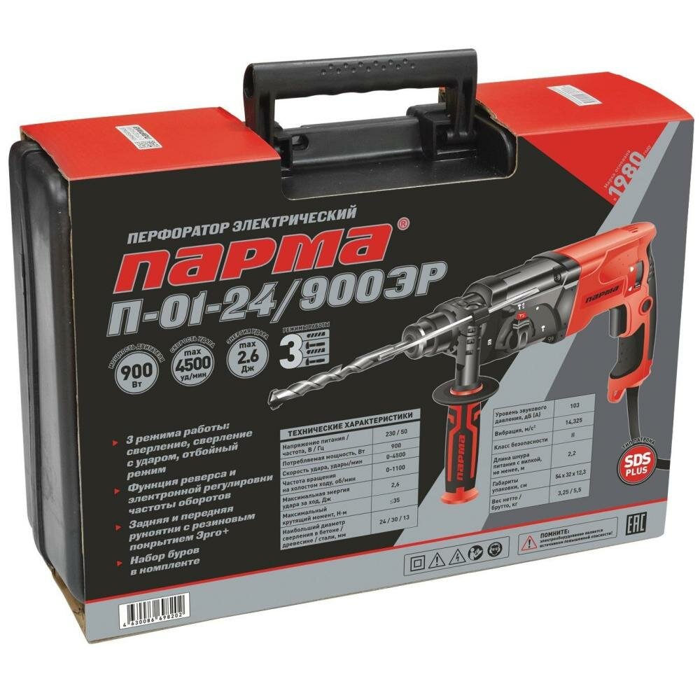 Перфоратор парма SDS-plus П-01-24/900ЭР (900Вт,3реж,2.6Дж,бетон 24мм) 3.25кг кейс+5 насадок