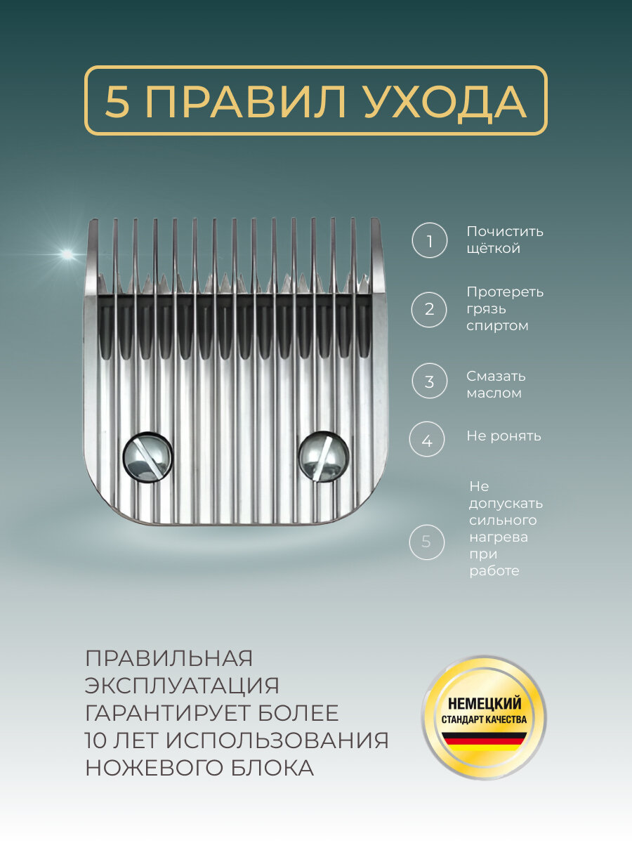| Дополнительная информация | шаг 3,06 мм; подходит для моделей Andis AGC2, Andis AGR+ Vet Pak, Andis Power Groom+, Andis Pulze, Artero Barber, Artero Premium, Andis SMC-2 Silver, Moser Class45/Max45, Moser Class50/Max50, Wahl Avalon, Wahl KM2, Wahl KM5, Wahl KM10; ножевой блок из легированной стали Star Blade; ширина ножа 46 mm |