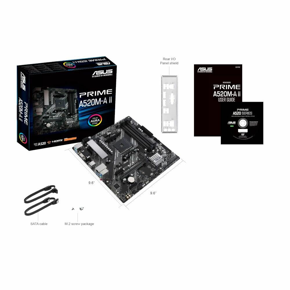Материнская плата mATX ASUS PRIME A520M-A II (AM4, AMD A520, 4*DDR4(4866), 4*SATA 6G RAID, M.2, 3*PCIE, 7.1CH, Glan, 5*USB 3.2, HDMI, DP, D-Sub)